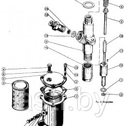 № Номер детали Наименование детали Кол-во в гр. Подгруппа 1112. Форсунка (рис. 8) 17.1112010-01 Форсунка (состоит из деталей 1—16) 4 17.1112110 Распылитель (состоит из деталей 15, 16) 4 1 245-1111021-А Обойма 4 2 245-1111022-А Прокладка 4 3 41.1112130 Штанга 4 4 41.1112192 Пружина 4 5 41.1112196 Винт 4 6 41.1112198 Контргайка 4 7 41.1112204 Колпак 4 8 41.1112206 Прокладка 4 9 14.1112024 Корпус форсунки 4 10 14.1112124 Гайка распылителя 4 11 11.1112028 Штифт 8 12 11.1112154-01 Штуцер 4 13 11.1112158 Прокладка 4 14 11.1112170 Фпльтр 4 15 5PF2114 Корпус 4 16 5PF2116 Игла 4 Подгруппа 1117. Фильтр тотлмвнкй тонкой очистки (рис. 9) 240-1117010-А Фильтр топливный (состоит из деталей 1— 14) 1 240-1117020-А Корпус фильтра (состоит из деталей 1, 2) 1 240-1117180 Крышка (состоит из деталей 4, 6, 8) 1 1 240-1117025-А1 Корпус 1 2 240-1117029 Шпилька 4 3 240-1117030 Элемент фильтрующий 1 4 240 1117101-А Болт штуцера 1 5 240-1117102 Прокладка 1 6 240-1117185-В Крышка 1 7 50-1117028 Пробка резьбовая 1 8 36-1104788 Кольцо 1 9 Д16-111 Втулка защитная (в запасные части) 2 10 Д18-051-А (А12.01.003.03) Болт поворотного угольника 2 11 Д18-055-А Кольцо уплотнительное 3 12 Д18-055-А-01 Кольцо уплотшпельгюе 2 13 М8-6Н.6.019 Гайка 4 14 8.65Г.06 Шайба 4